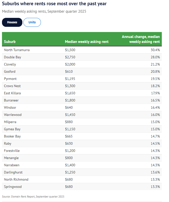 The following article was taken from The Sydney Morning Herald. Read the article in full below: https://www.smh.com.au/property/news/sydney-suburbs-where-rents-rose-most-over-the-past-year-20251001-p5mzby.html